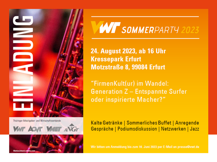 Erstmalig veranstaltet der Verband der Wirtschaft Thüringens sein neues Veranstaltungsformat "VWT-Sommerparty" am 24. August 2023.